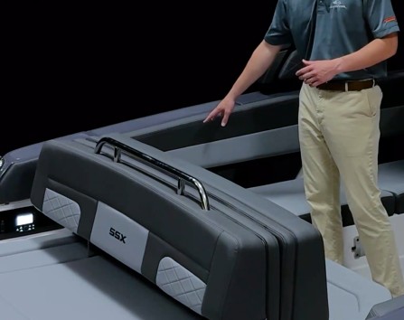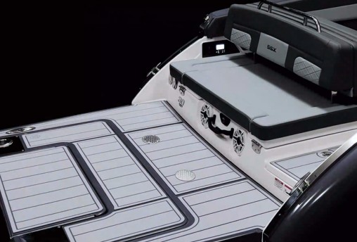 The SSX 30 stands out as a leader in design, performance, and functionality. As the largest model in the SSX stern-drive line, it combines power with agility and responsiveness. The helm is equipped with the latest touchscreen technology, while the cockpit is open and spacious, featuring a multi-position sun lounger. With a 9-foot beam, the cockpit offers ample space extending all the way to the bow area, which includes hinged storage beneath luxuriously appointed upholstery. Additionally, the standard Infinity Power Step swim platform makes enjoying water activities effortless.